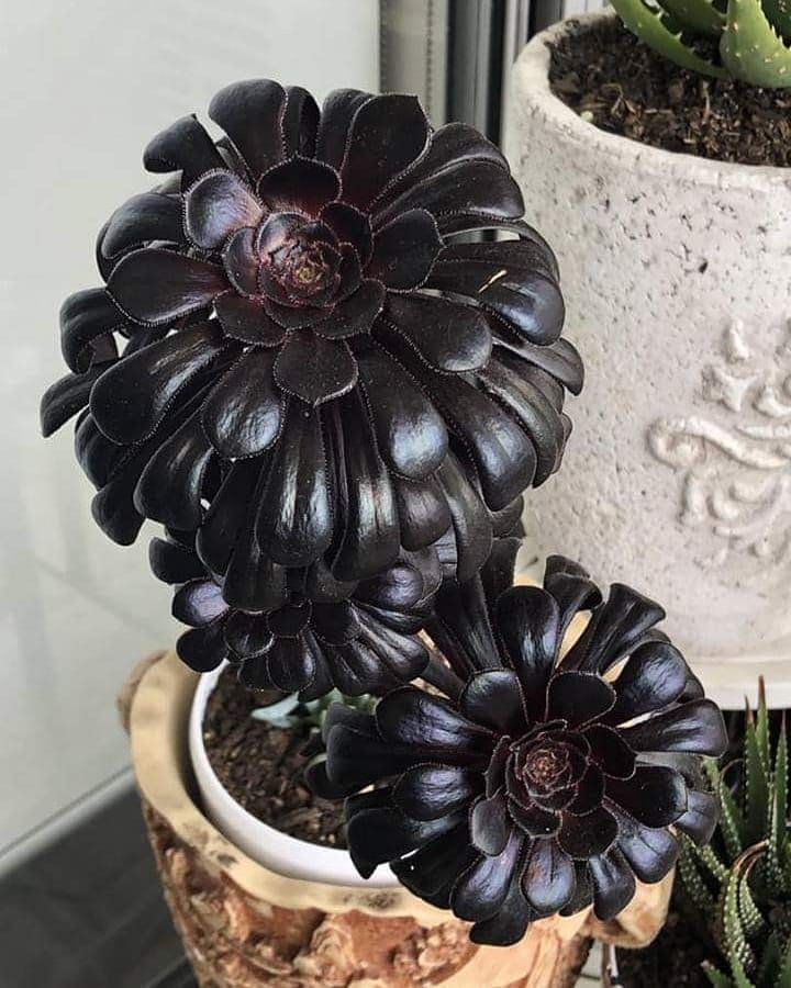 La rosa negra ‘Zwartkop’ (Aeonium arboreum var. atropurpureum) es una suculenta fascinante que presenta rosetas de hojas oscuras, casi negras y brillantes.