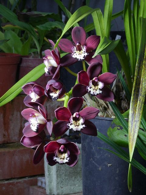 La Cymbidium ‘Kiwi Midnight’, una orquídea rara y de color oscuro, produce flores exóticas de un intenso tono borgoña negruzco. Esta llamativa orquídea prospera con luz brillante e indirecta y requiere un ambiente húmedo.