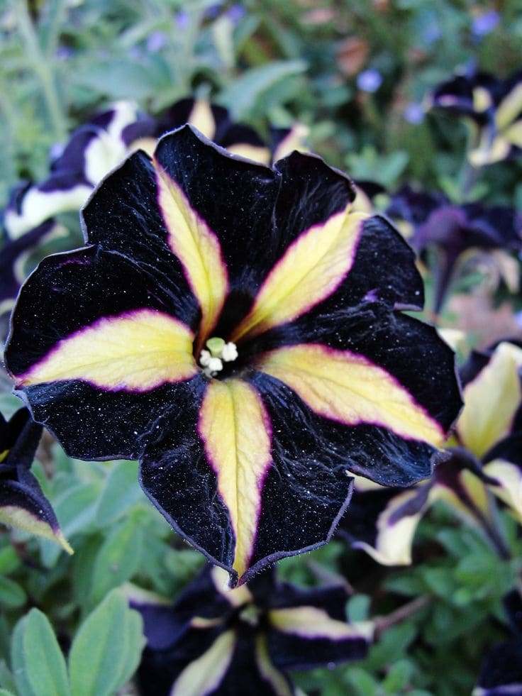 Petunia ‘Phantom’, una prima llamativa de ‘Black Velvet’, muestra pétalos de color negro intenso acentuados por un patrón de estrellas de color amarillo brillante.