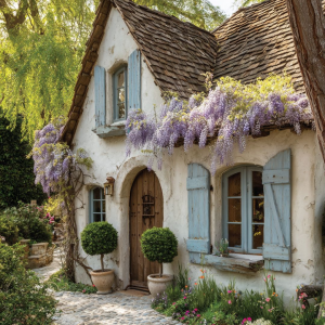 Wander into this fairy-tale cottage with pastel blue shutters and wisteria vines. The interior is enchanting.