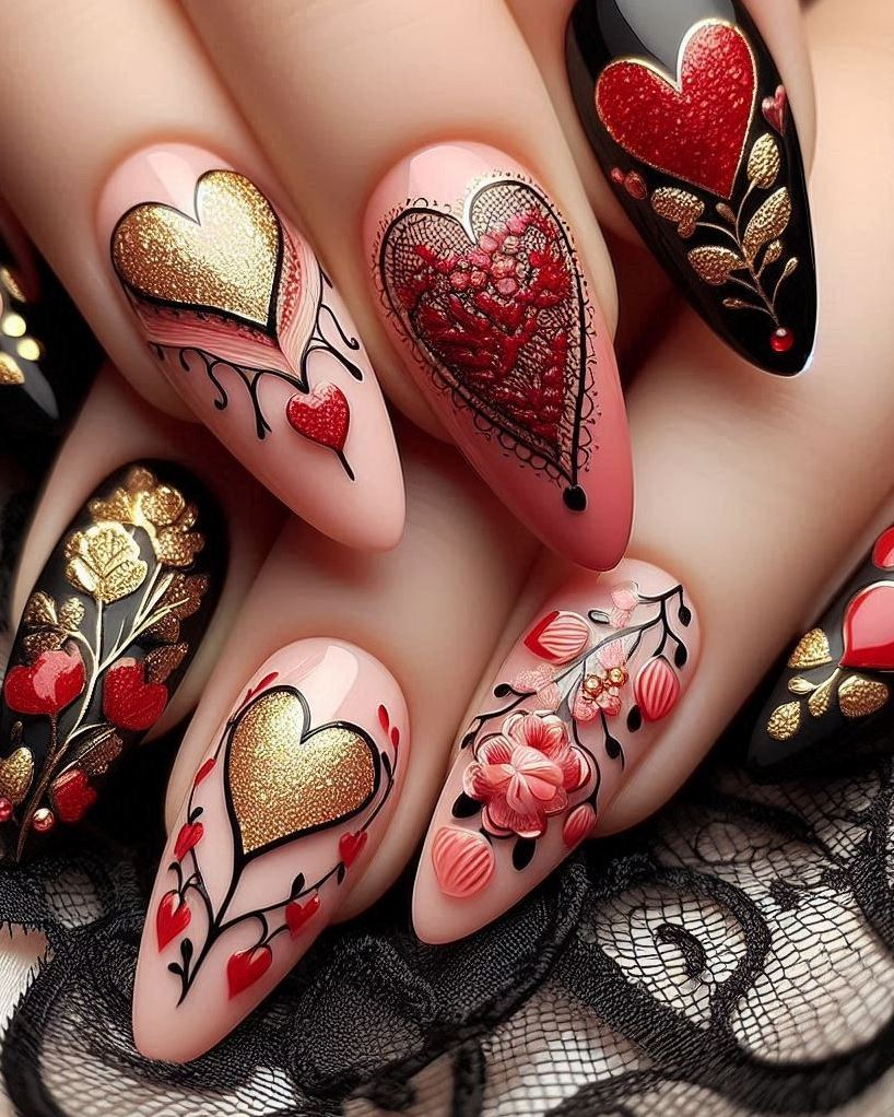 Heart Nail Art Ideas: Black, Red, and Gold Glam