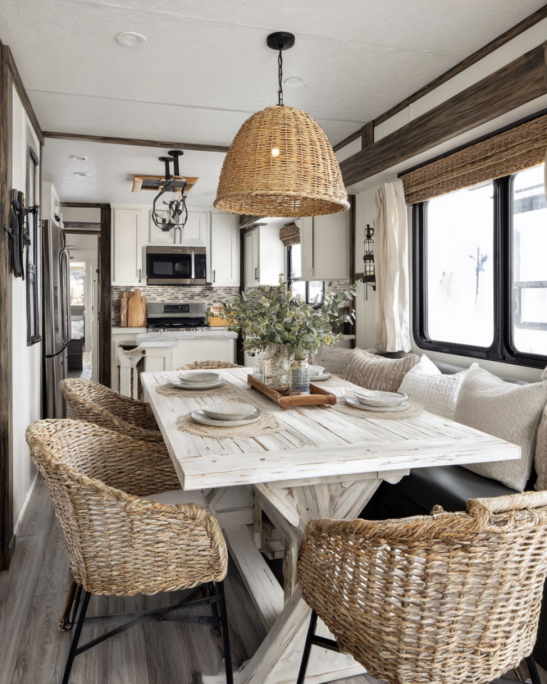 The dining area continues the coastal theme with a whitewashed wooden table and wicker chairs, creating a casual yet stylish setting for meals. A warm pendant light hangs above, casting a soft glow that enhances the room’s inviting ambiance. The design balances rustic elements with contemporary style, making it a perfect spot for family gatherings or quiet dinners. The space is designed to be both functional and aesthetically pleasing, with easy access to the kitchen for seamless entertaining.