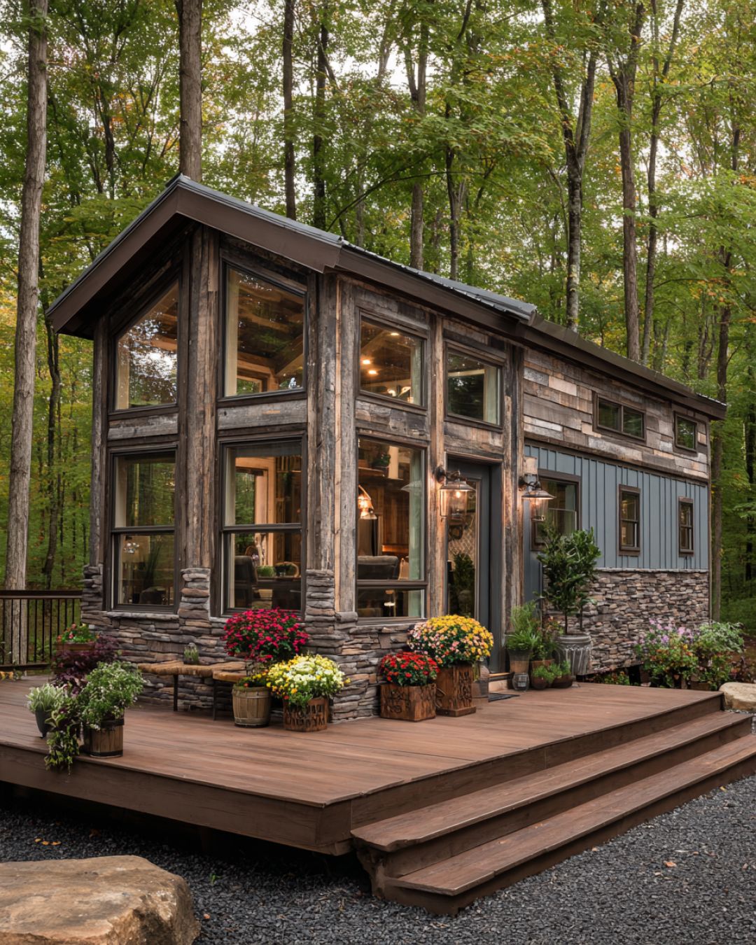 The charming woodland cabin is nestled amidst a tranquil forest setting, exuding a rustic charm with its exterior clad in weathered timber and stone accents. Expansive windows adorn the facade, inviting abundant natural light into the interior and offering breathtaking views of the surrounding woodlands. The cabin rests on a spacious wooden deck, decorated with potted plants and colorful flowers, bringing a vibrant touch to the serene landscape. The color scheme is warm and earthy, featuring rich browns, soft grays, and lush greens that harmoniously blend with the forest environment, while towering trees form a picturesque backdrop.