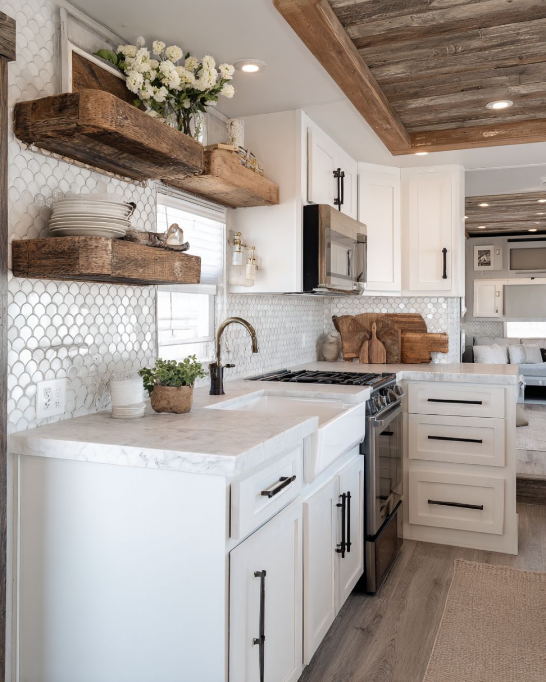 The kitchen offers a perfect balance of rustic and contemporary elements, featuring white cabinetry that provides a clean and crisp look. Reclaimed wood shelving adds a touch of rustic charm, while white quartz countertops offer a durable and elegant surface for cooking. A wave-patterned subway tile backsplash brings a subtle coastal element, tying in with the overall theme of the home. The kitchen is both stylish and practical, designed for efficiency and comfort.