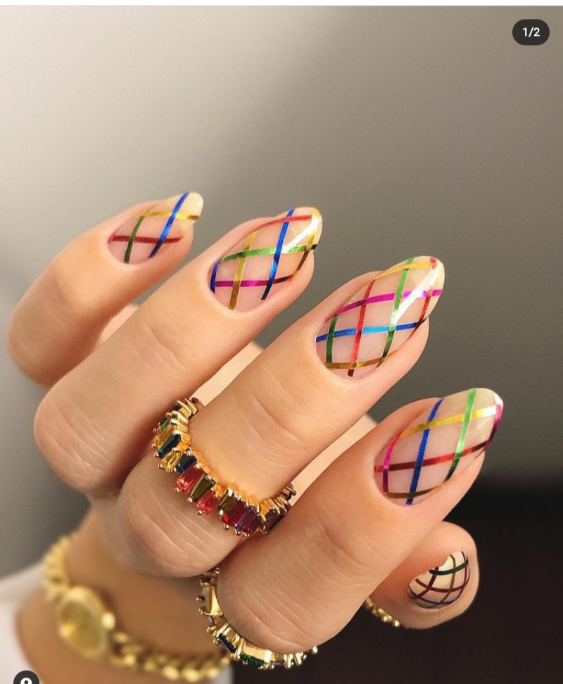 - Add embellishments: Tiny studs or rhinestones at the intersections of the lines can give your nails a bit of extra glamour.