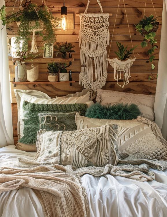 The bedroom is a serene oasis that continues the home’s bohemian motif. The bed, layered with an array of textured blankets and cushions, sits against a wooden accent wall adorned with hanging planters and dreamcatchers. Soft, flowing curtains frame the windows, allowing natural light to filter through and create a peaceful ambiance. Lantern-style bedside lamps and a collection of cherished books and trinkets on floating shelves complete the cozy, personalized space.