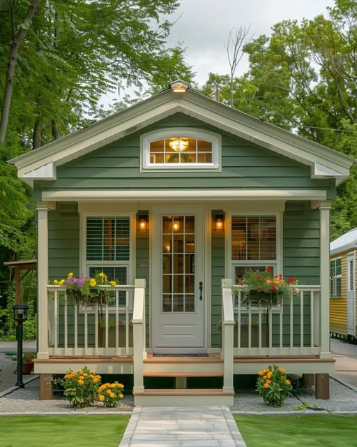 The exterior of this captivating park model RV features a soothing green vinyl siding that effortlessly blends with various natural settings. Adorned with detailed floral motifs, the exteriors portray a seamless fusion of function and artistry. Large windows usher in abundant natural light, while the charming front porch with vintage-style railings beckons visitors to sit back and relax. The overall look is completed with a soothingly pitched roof, creating a harmonious blend of rustic charm and bohemian whimsy.