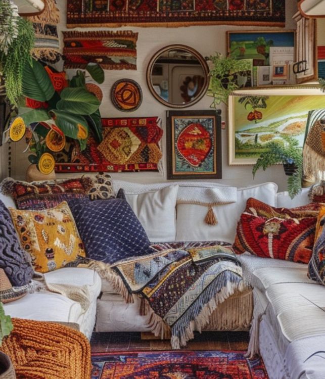 As you step into the living area, you are greeted by a bohemian wonderland, where every detail is thoughtfully curated to exude warmth and creativity. Rich, colorful textiles drape the seating, complemented by an array of eclectic throw pillows and handwoven rugs. Natural wood accents and plants in macramé hangers add a touch of organic sophistication. The walls are adorned with an assortment of artwork and mirrors, turning the space into a vibrant gallery that invites inspiration and relaxation.