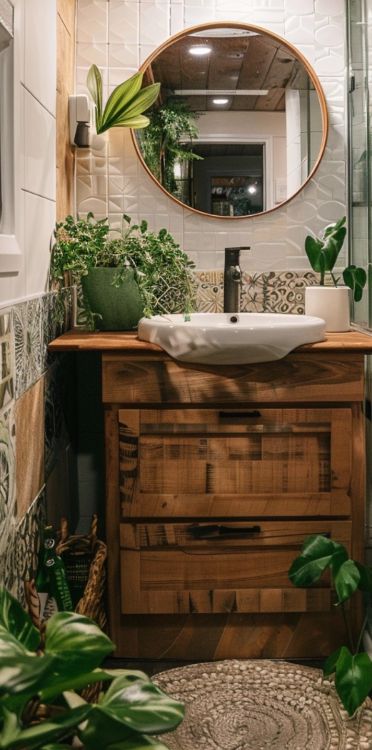 The bathroom, while compact, does not compromise on style. Clad in intricate, vintage-inspired tiles, it exudes warmth and character. A reclaimed wood vanity supports a sleek, modern sink, while a round, gilded mirror above adds a touch of elegance. Plants thrive in every corner, adding a burst of freshness and life. The shower, framed with glass doors, features a rain showerhead and a pebble-stone floor, making it a luxurious space to unwind.