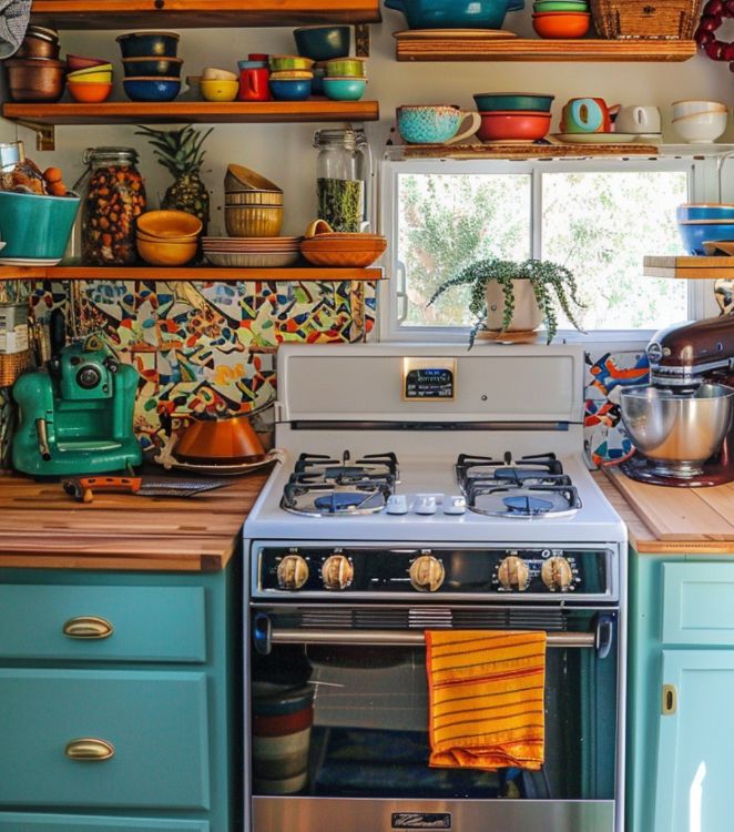 The kitchen, although small, is a hub of creativity and functionality. Open shelving showcases an assortment of colorful ceramics and artisanal cookware, while the countertops are adorned with potted herbs and vibrant kitchen tools. A vintage-inspired stove and refrigerator maintain the retro theme, and a mosaic tile backsplash adds a splash of dynamic color. This space is all about the joy of cooking and the beauty of everyday items displayed with pride.