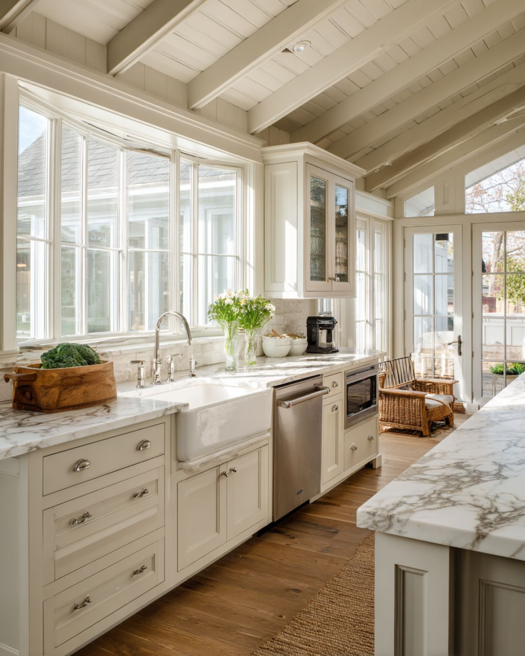 The kitchen is a seamless blend of functionality and style, featuring classic custom cabinetry and marble countertops. A farmhouse sink adds to the rustic charm, while state-of-the-art appliances ensure modern convenience. The space is designed to be both practical and aesthetically pleasing, with ample storage and work areas. Large windows allow natural light to flood the room, creating a bright and welcoming environment for cooking and gathering.