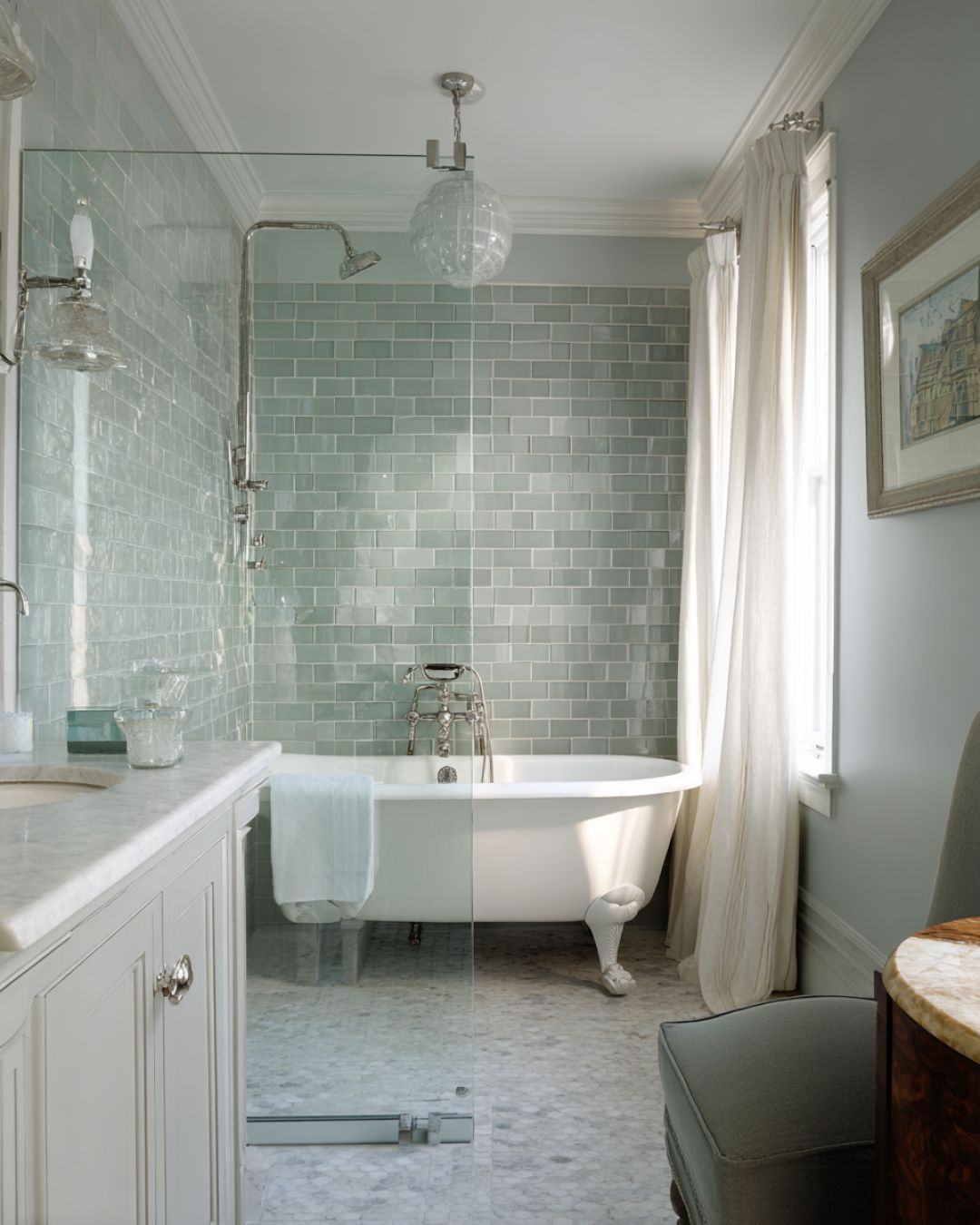 The bathroom combines elegance with practicality, featuring a classic clawfoot tub that invites relaxation. Subway tiles line the walls, adding a timeless touch, while polished nickel fixtures provide a sleek, modern contrast. The use of soft, muted colors creates a soothing atmosphere, making the space feel like a luxurious spa retreat. Thoughtfully designed for functionality, the layout ensures ease of use while maintaining an air of refined style.