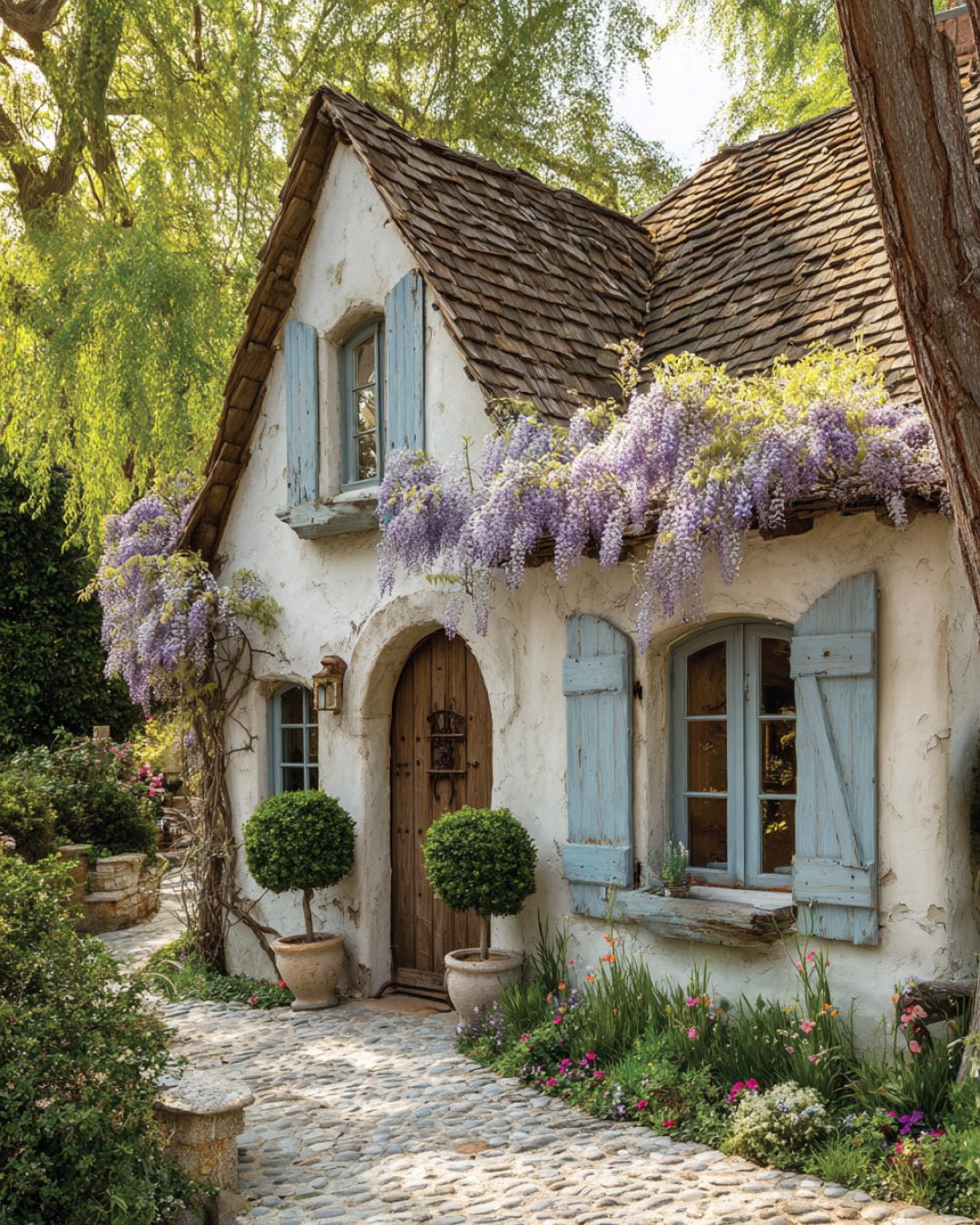 The exterior of this whimsical cottage is a picture-perfect vision of fairy-tale charm. Its white plaster walls and steeply pitched roof with rustic wooden shingles create a cozy, inviting silhouette. The arched wooden door, flanked by two neatly trimmed topiary trees, serves as a welcoming focal point. Wisteria vines, adorned with clusters of soft purple blooms, gracefully drape over the entryway and windows, adding a touch of magical allure. The weathered, pastel blue shutters on the windows enhance the cottage’s enchanting appeal, while the cobblestone pathway meandering through a carpet of verdant grass and colorful flowering plants invites visitors to explore this serene and secluded haven.